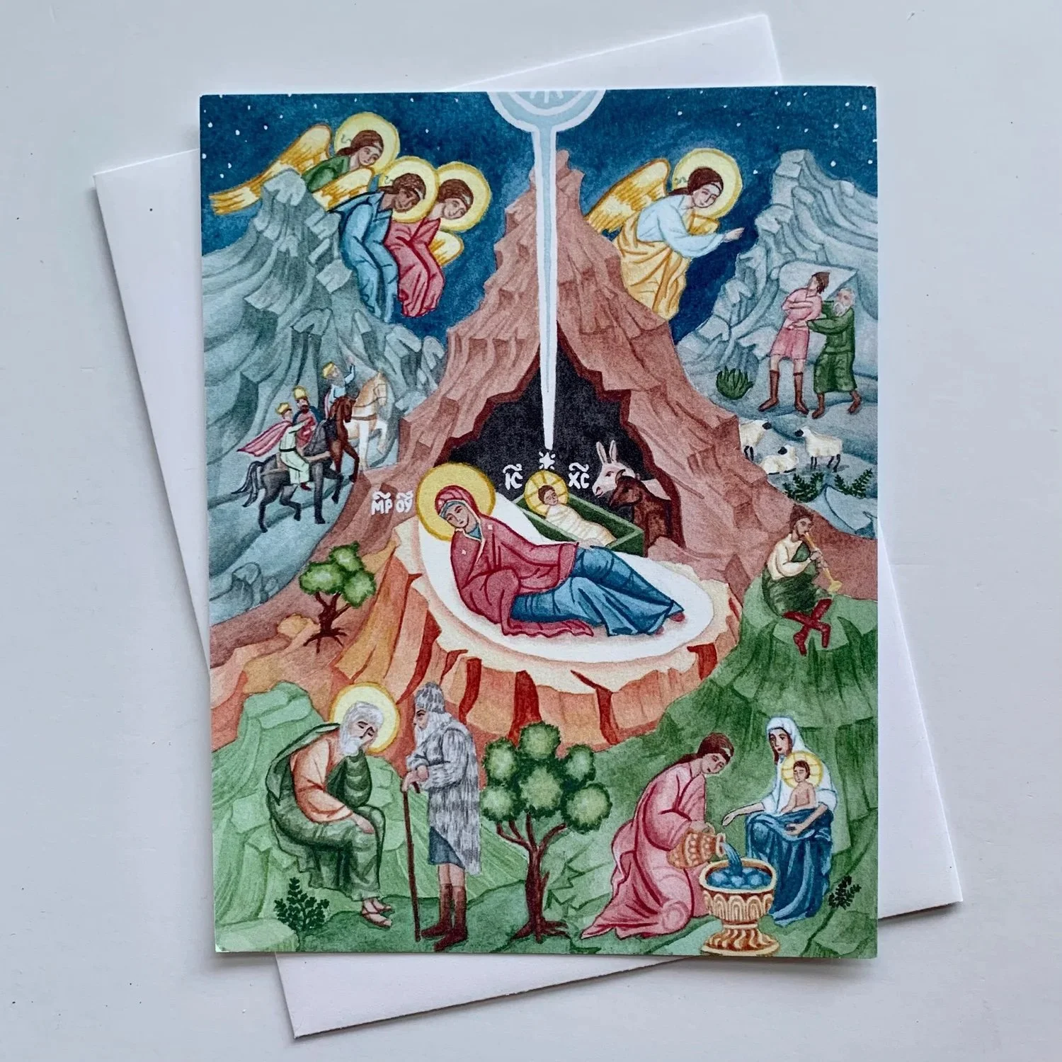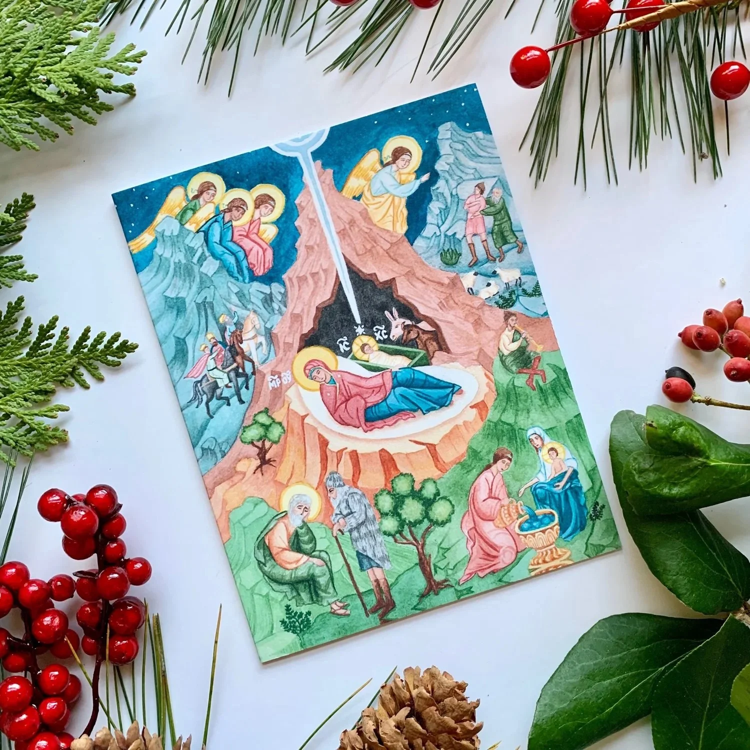 Set of 4 folded cards featuring a watercolor painting of the Nativity icon. Perfect for sending a Christmas greeting or including with a gift, these cards are blank inside. (You can also find this painting featured in the 2023 Orthodox Children’s Calendar, along with explanations of many fascinating and meaningful details of the icon!)
